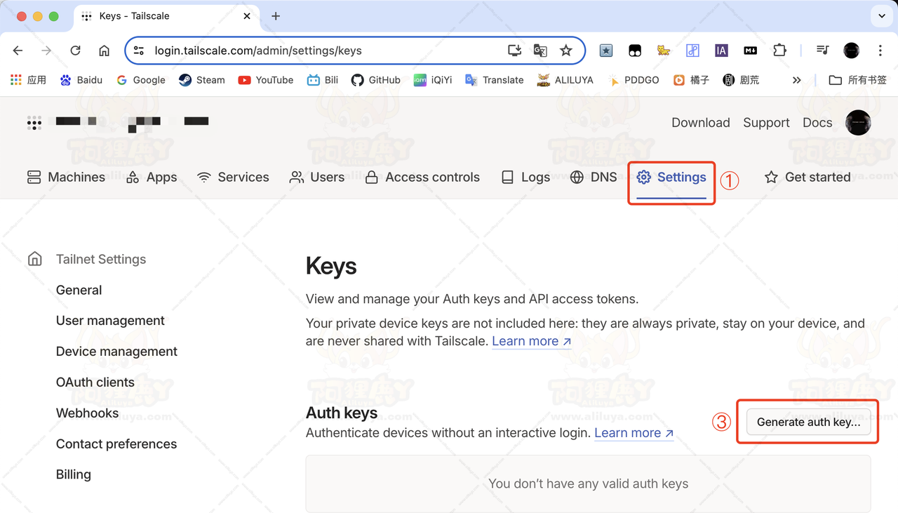 进入后台,点击【Settings】之后点击左边【Keys】在 Auth keys 中点【Generate auth key…】生成一个身份验证的密钥。