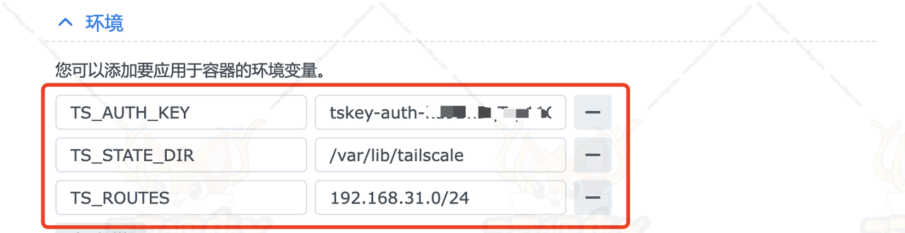 (此处的Auth key就是我们刚刚开始Tailscale官网生成的身份验证密钥)第二个变量:TS_STATE_DIR,值:/var/lib/tailscale