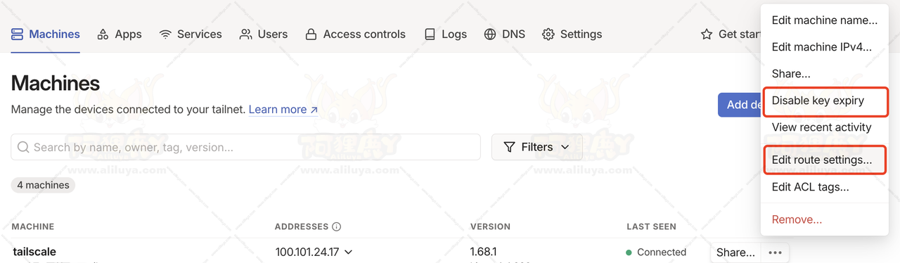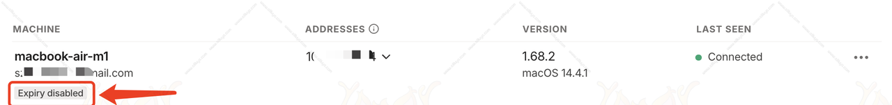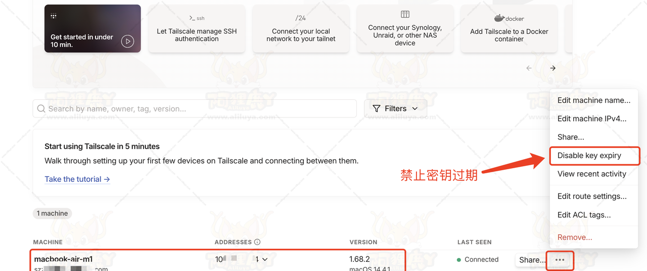 之后返回首页往下拉就可以看到链接成功的设备。如果设备是私用的自己经常都需要用到的,我们可以设置一下授权密钥禁止过期。点击设备后面的三个点,选择【Disable key expiry】开启禁止密钥过期选项。