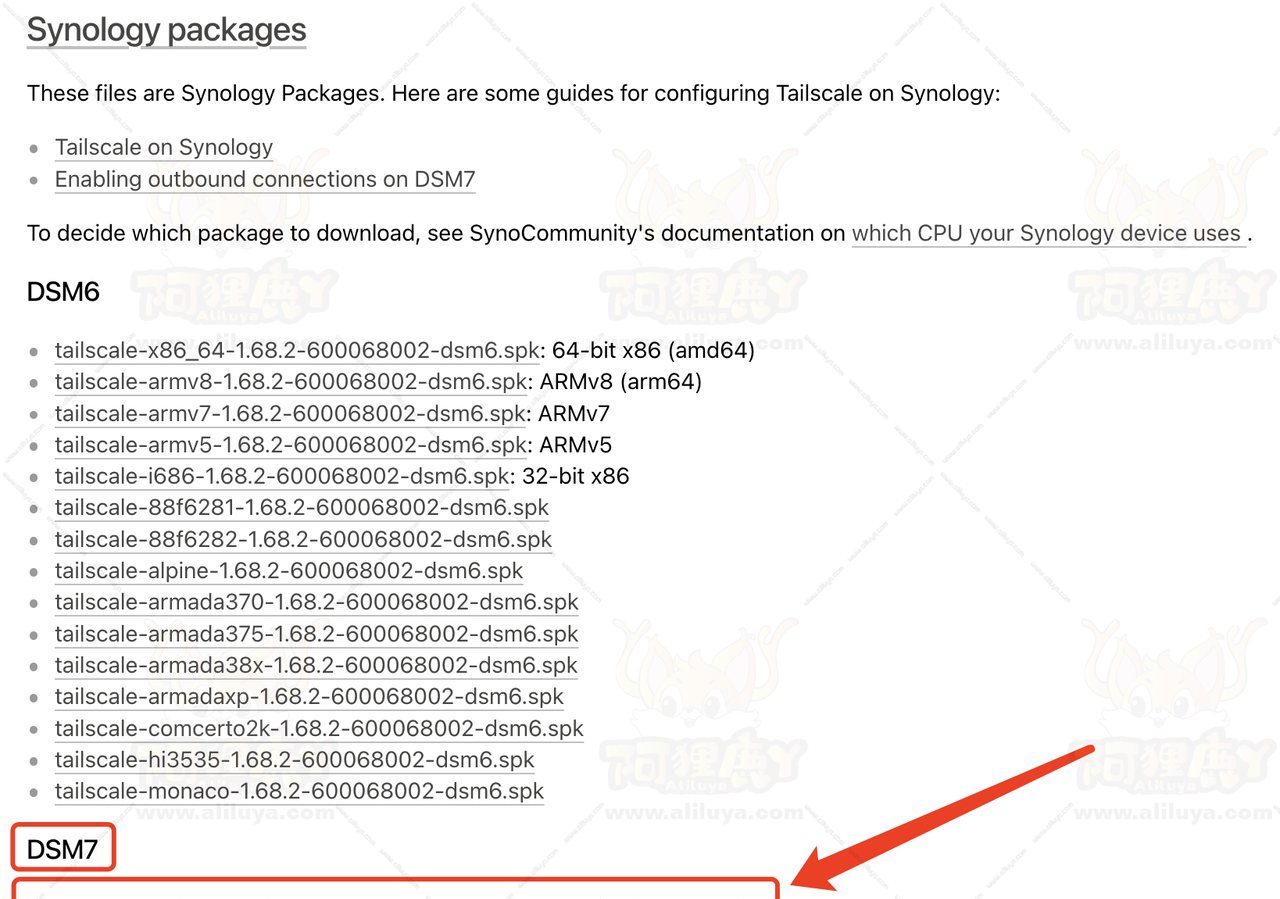 推荐下载稳定版本,进入下载页面之后可以看到群晖的Tailscale所有版本的安装包。我群晖是x86的系统版本是DSM7.2系统,所以我这需要下载DSM7的x86版本的套件进行安装。