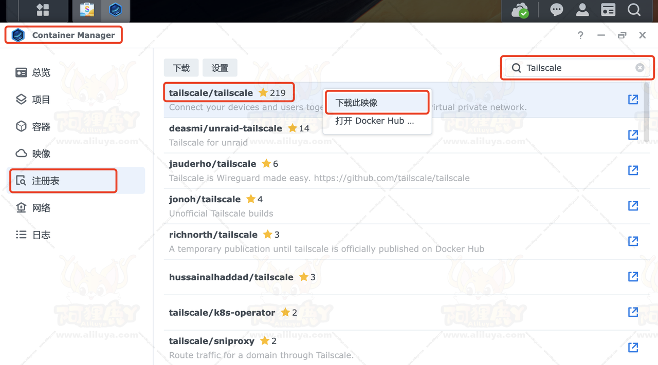 按照下面步骤拉取Tailscale镜像。注册表 – 搜索”Tailscale” – 下载镜像