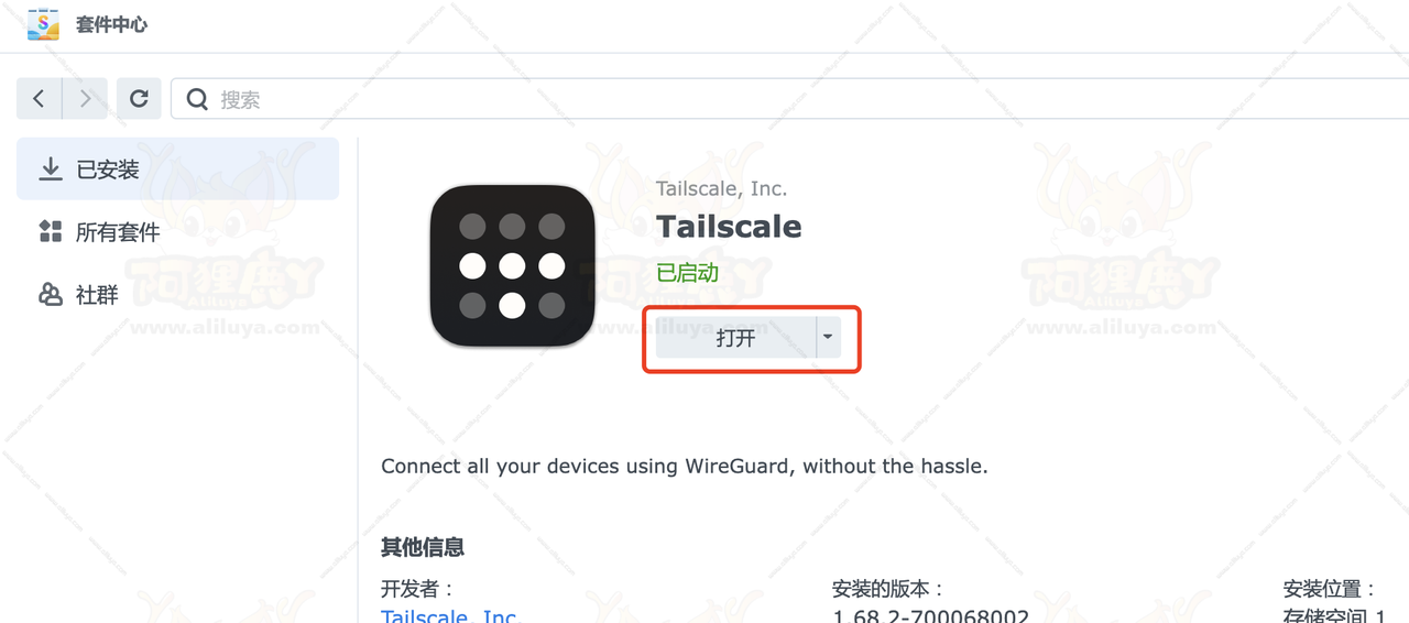 安装完成之后回到套件中心,点击已安装里面可以看到Tailscale套件已经安装完成。点击Tailscale套件 选择打开。