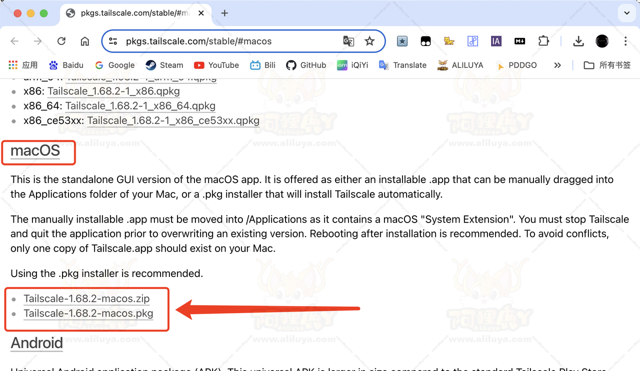 Tailscale macOS安装包:https://pkgs.tailscale.com/stable/#macos