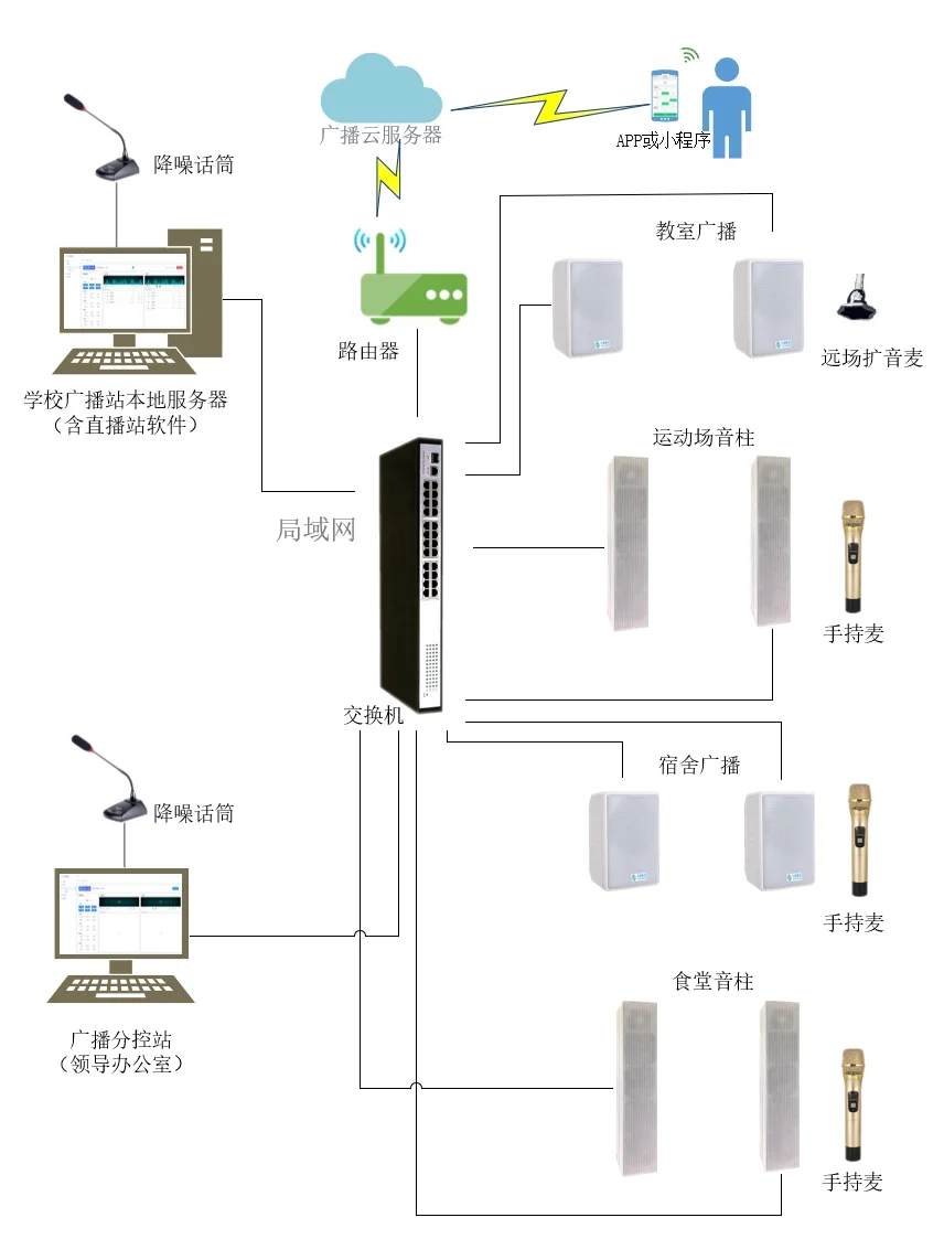 声音同步化:广播站直播,操场无线话筒对讲,实现声音完全同步,极低延时。