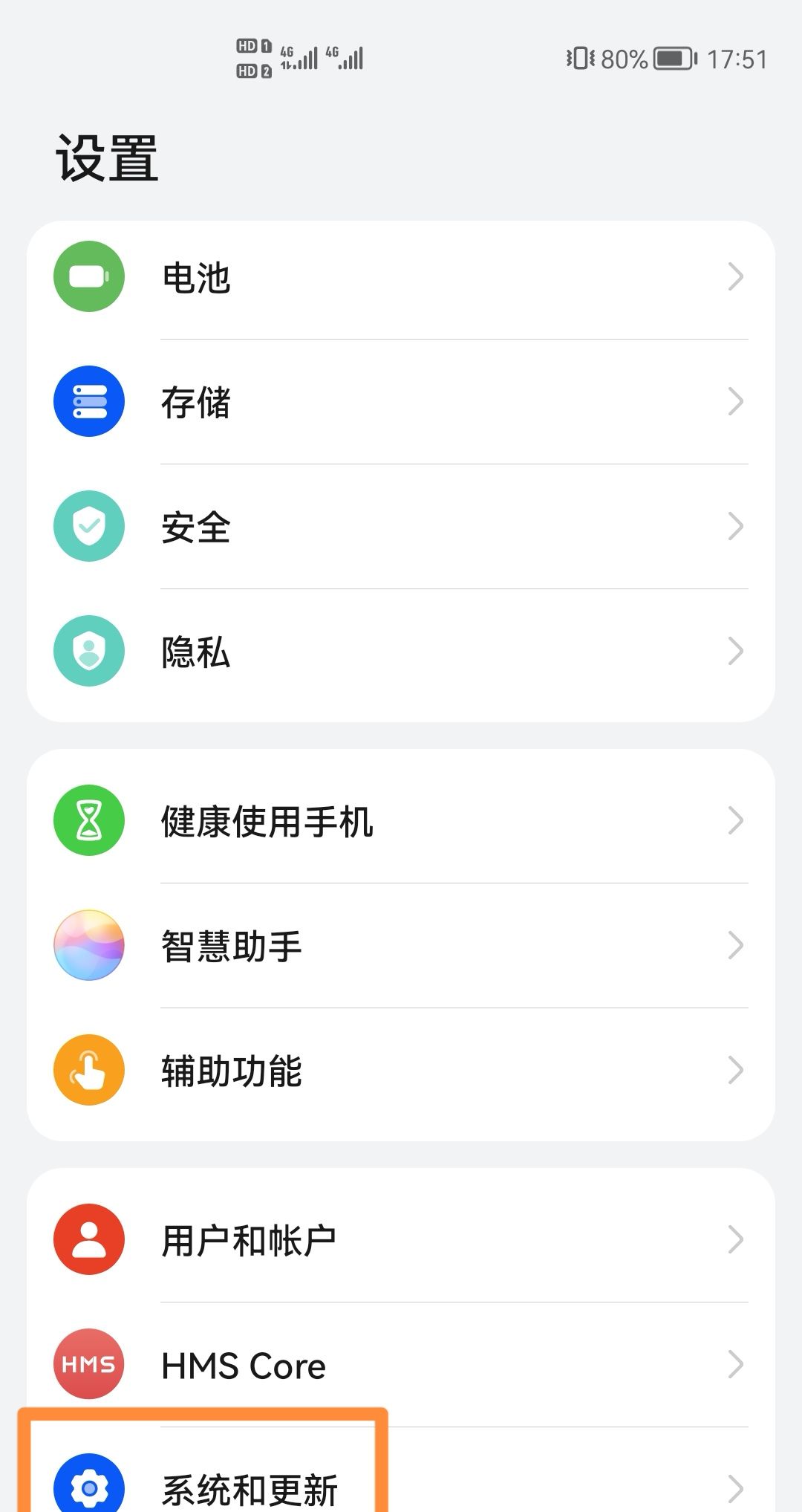 手机屏幕上的快捷圆圈是手机的悬浮导航按钮,设置方法∶1.打开手机设置,点击系统和更新。